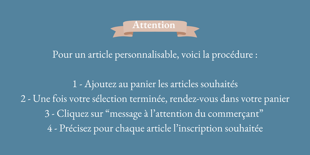 Chaque article est réalisé à la commande, le délai de fabrication est de 1à 5 jours ouvrés maximum + délai de livraison (si besoin)